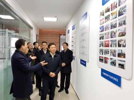 邢書記在企業(yè)文化墻駐足,了解企業(yè)發(fā)展史及園區(qū)招商引資過程,公司領(lǐng)導(dǎo)向邢書記介紹,從園區(qū)領(lǐng)導(dǎo)登門拜訪到項(xiàng)目簽約、裝修開工、完工搬遷、企業(yè)入駐,只用了不到一年的時(shí)間。