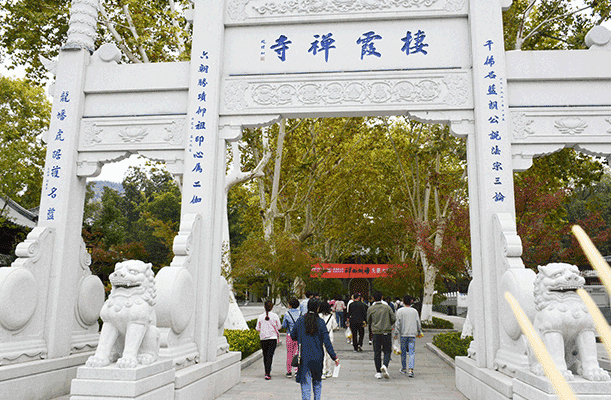 步入山門過(guò)草坪登石階,一派褚紅的高墻迎面壁立,中間大門的額墻上書“棲霞古寺”,我們的隊(duì)伍在這座已有1500多年歷史的古剎中依次穿過(guò)彌勒殿、昆靈寶殿、毗盧寶殿,見到了正殿供奉的主尊——毗盧遮那佛,還見到了站在鰲頭上的南海觀世音。