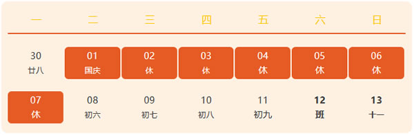 10月1日至7日,共計(jì)7天,9月29日(星期天),10月12日(星期六)全天上班。