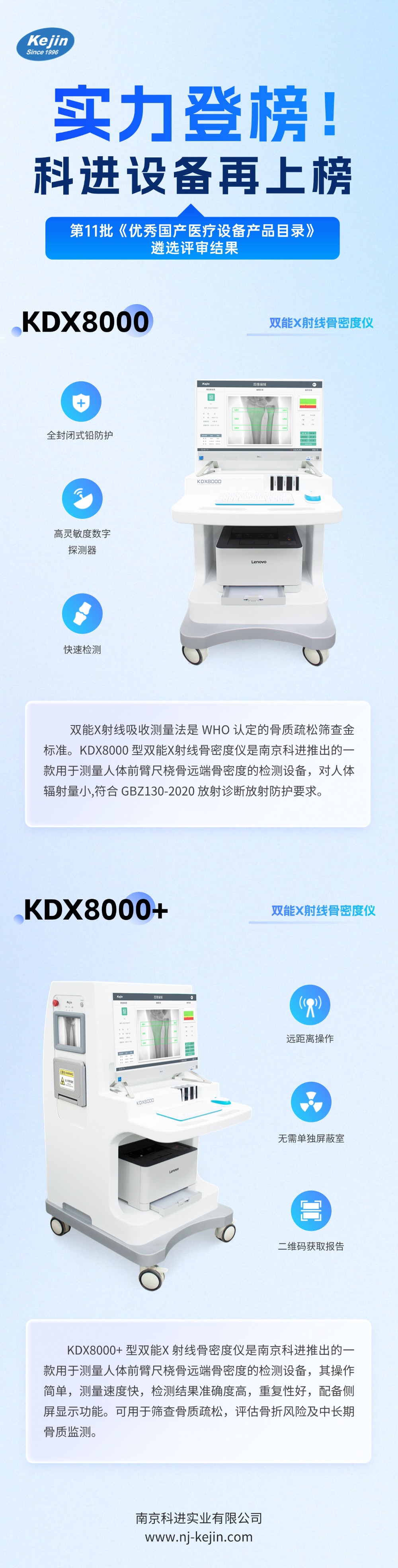 2025年9月16日,由中國(guó)醫(yī)學(xué)裝備協(xié)會(huì)組織的第十一批《優(yōu)秀國(guó)產(chǎn)醫(yī)療設(shè)備產(chǎn)品目錄》遴選評(píng)審工作已完成,評(píng)審結(jié)果開放公示。由南京科進(jìn)實(shí)業(yè)有限公司自主研發(fā)生產(chǎn)的雙能X射線骨密度儀KDX8000、KDX8000+成功入選!