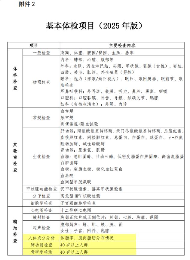 2025年11月4日,國家衛(wèi)生健康委辦公廳正式發(fā)布《成人健康體檢項目推薦指引(2025年版)》(以下簡稱《指引》),明確提出在成年人健康體檢中,應進行體格檢查、實驗室檢查和輔助檢查,并將 人體成分分析 列入成人基本體檢項目,同時強調 40歲以上人群需增加肺功能檢查和骨密度檢測。