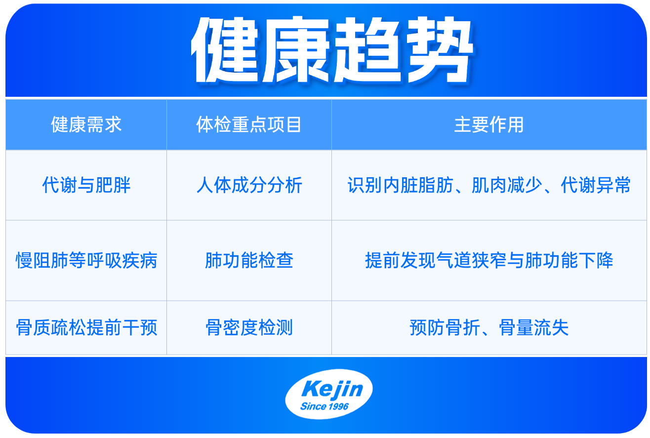 這意味著,我國健康體檢正從“查疾病”走向“查風險、早預防、重管理”,體檢不再只看體重、血脂,而是需要通過更精細的檢測評估身體構成、代謝狀態(tài)、呼吸功能與骨骼健康。