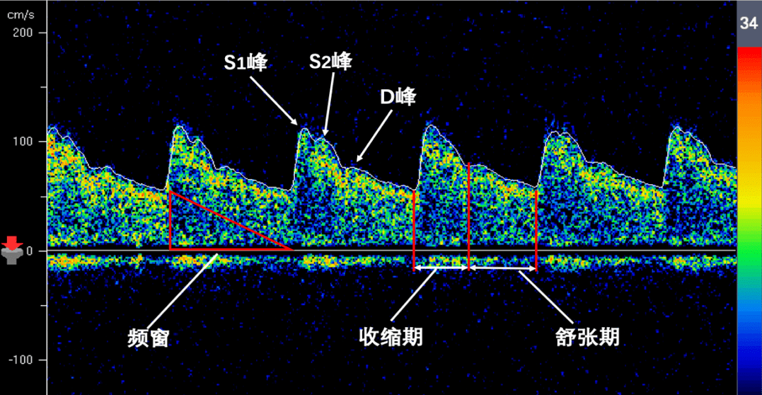 一個(gè)心動(dòng)周期的頻譜包括收縮期峰和舒張期峰,其中收縮期通常有兩個(gè)峰(S1 峰和 S2 峰,S1 峰>S2 峰),舒張期為一個(gè)峰(D 峰)。